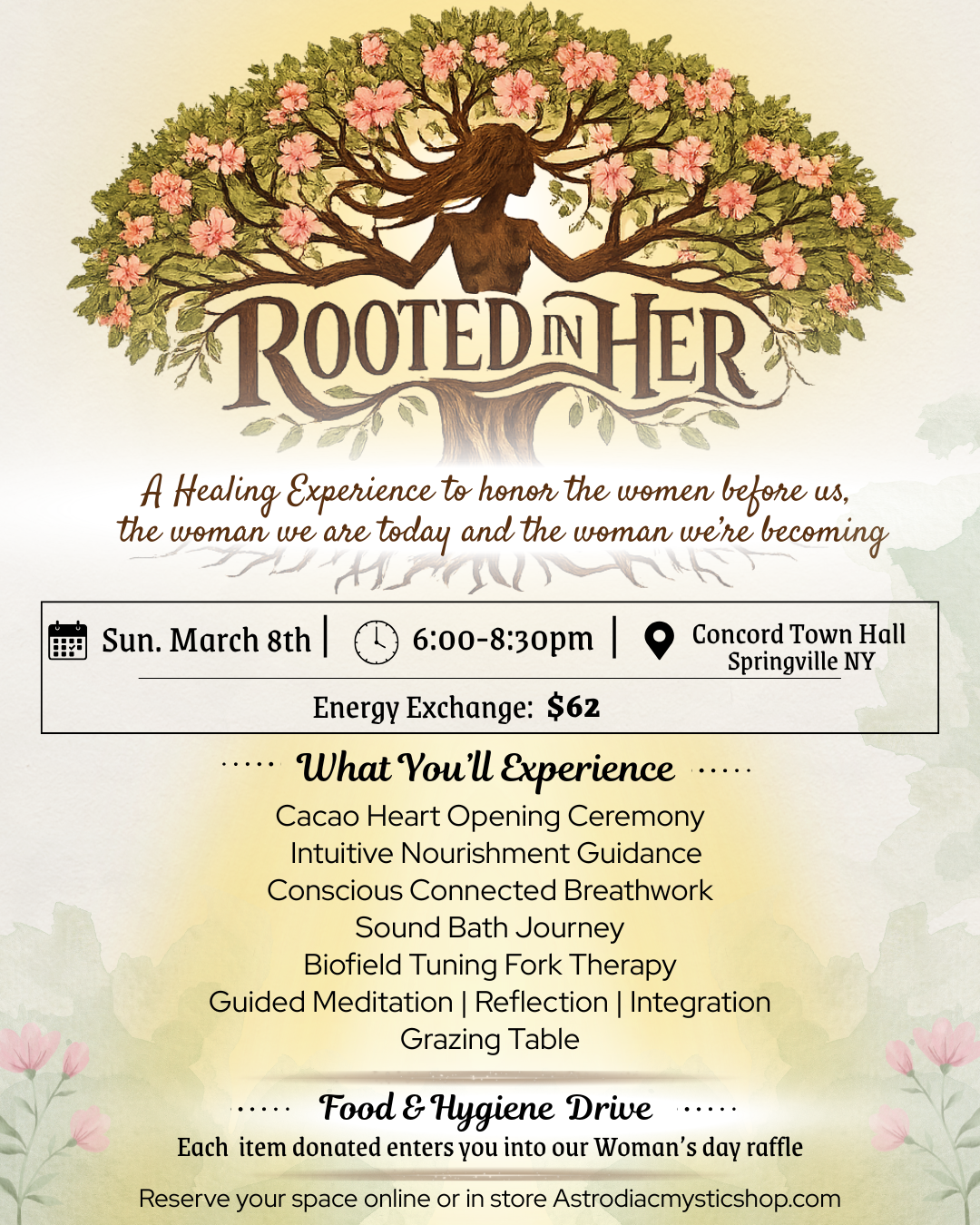 This experience is centered around Women’s Day and honoring feminine lineage and embodiment. All who resonate with this intention are welcome.